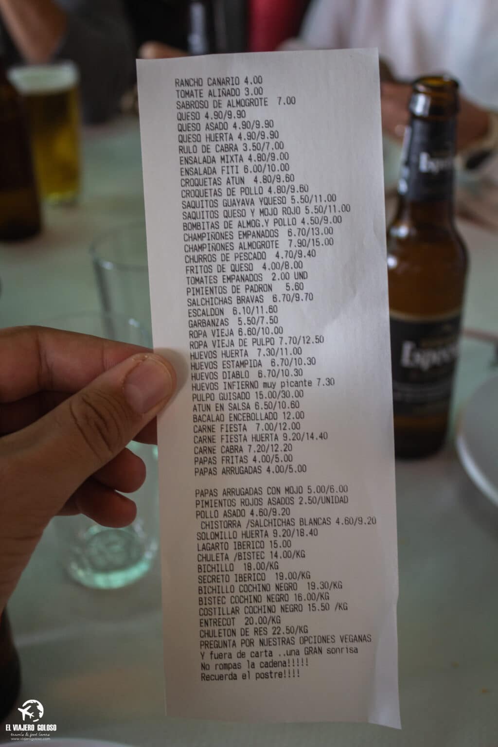 Como es lógico, la carta de «Guachinche La Huerta de Ana y Eva» es clásica y ofrece lo mejor de la gastronomía tinerfeña, añadiendo también varias carnes típicas de la zona (alguna os mostraremos más adelante). En este caso, y como en la mayoría de restaurantes a los que vamos y su carta nos abruma un poco, nos dejamos llevar por las recomendaciones del servicio, que fueron totalmente acertadas.