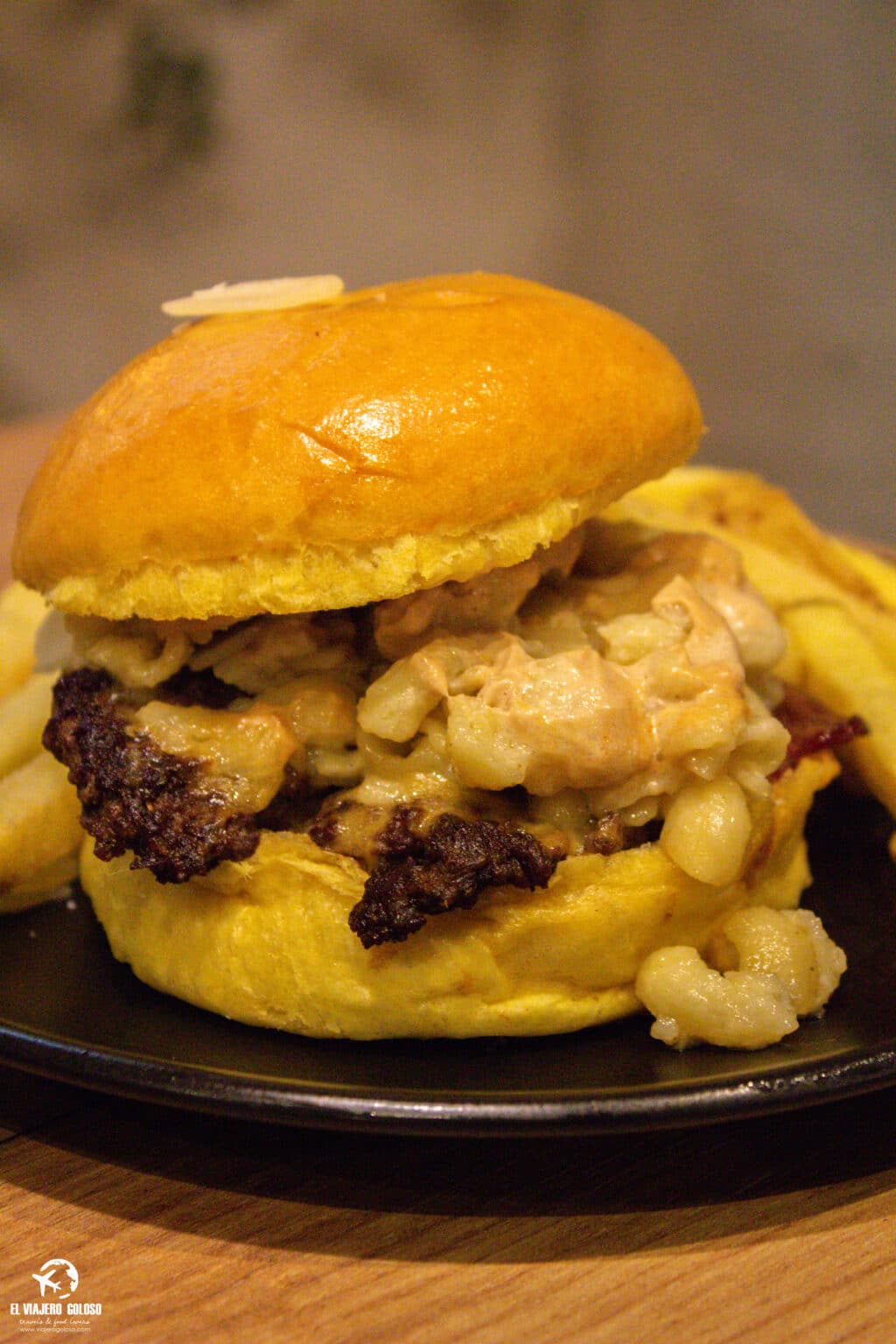 Comenzamos con la «Macandcheese», una smash de vaca madurada, cheddar, bacon, bechamel de parmesano, macandcheese y mayocué (10,95€ + 1,50€ patatas). Demasiado extravagante para nuestro gusto aunque con su punto especial de queso que gustará a muchos. A priori, era la hamburguesa que tenía más complicado agradarnos ya que en nuestra mente no entra que una hamburguesa lleve macarrones (WTF!) pero al final cuando mezclas el sabor de todo la sensación es buena.